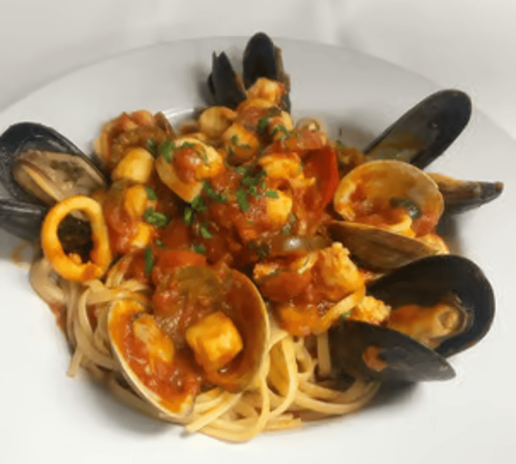 Linguine pasta, mussels, clams, calamari, shrimp, scallops, spicy tomato sauce, & fresh basil