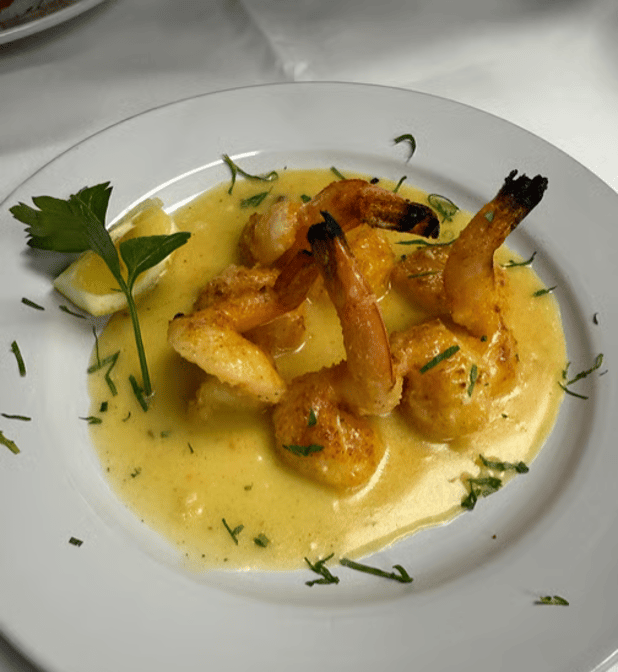Shrimps Sauteed w/ Mushrooms, Sweet Peppers, Green Peas, Cognac Sauce